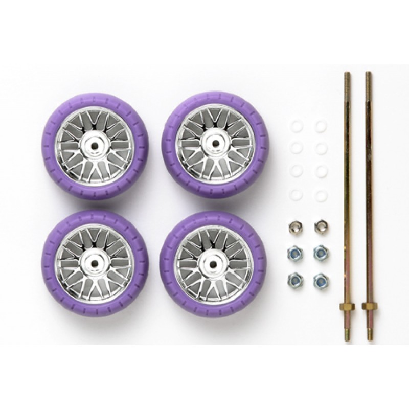> TAMIYA田宫模型 > 田宫四驱车 MINI4WD > 车轮 车胎 > TAMIYA 田宫 四驱车 限量版 大口径银色电镀轮毂 紫色胎皮锁轮 94707 スーパーX ナット止め大径メッキホイール&パープルバレルタイヤ (低摩擦ワッシャー付) SUPER X NUT FASTENED PLATED WHEELS