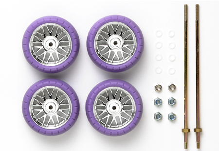 両ネジシャフトにロックナットでホイールを確実に固定できるナット止めホイールの大径タイプです。パープルカラーのナローバレルタイヤをセットして、シルバーメッキ仕上げのメッシュホイールとともに足もとを引き立てます。フッ素樹脂製ワッシャー8枚付き。ホイールとシャーシの間にセットして摩擦抵抗を少なくします。スーパーXシャーシ用。
