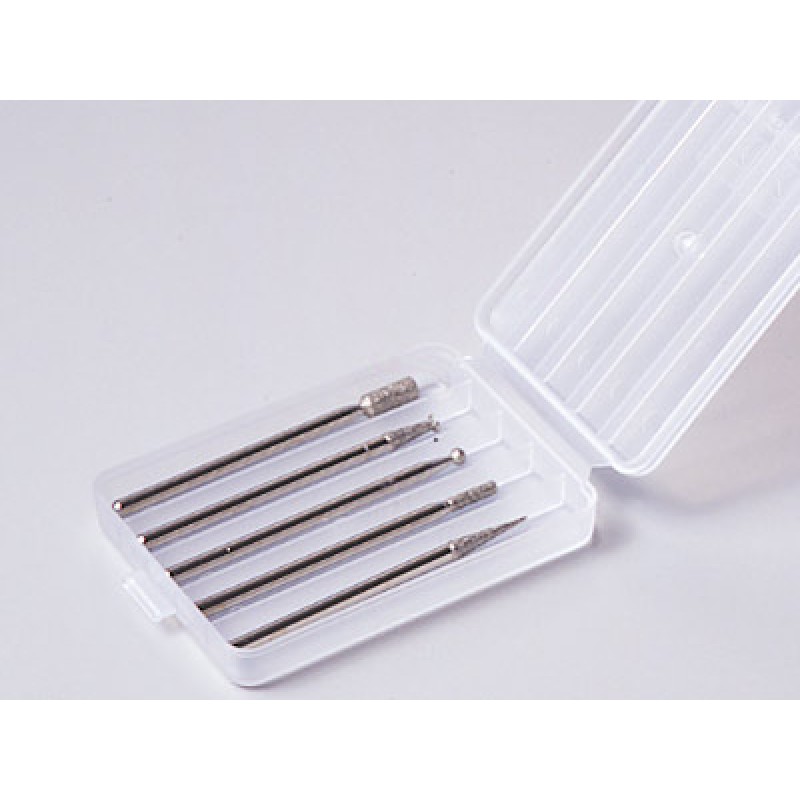 広い面積の削り加工に活躍する円柱形、穴を広げるのに最適な円錐形、溝加工などに便利に使える変形円柱形、球状ヤスリタイプなど5種類のビットをセットしました。電動リューターに装着でき、目的によって使い分ければ削り加工の幅がさらに広がります。先端は目詰まりしにくいダイヤモンドヤスリタイプ。