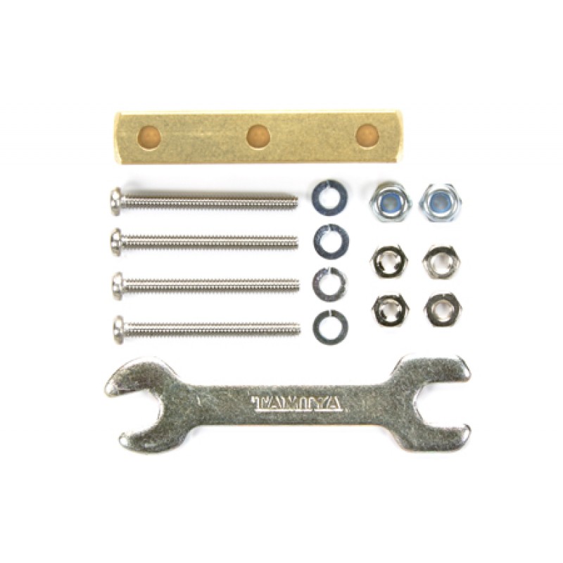 ★ジャンプ後の着地などでマシンの跳ねを押さえるブロックタイプのマスダンパーです。★取り付け穴を5ヶ所用意して様々な場所に設置でき、セッティングも楽しみ。★固定式のウェイトとしても使えます。★取り付け用のステンレスビスやロックナット、スプリングワッシャー、板レンチなどもセットしました。★8.3g、真ちゅう製。