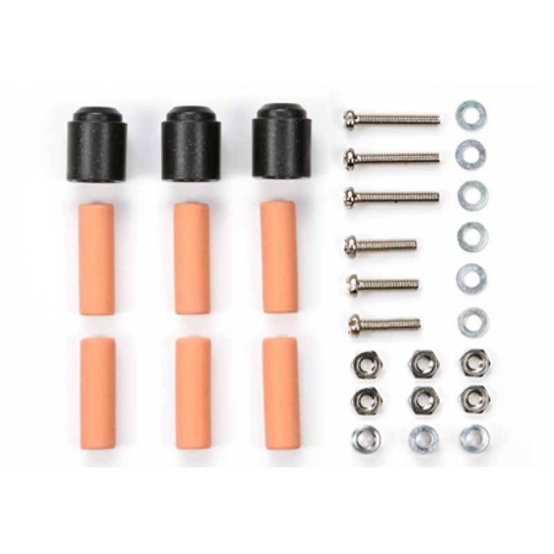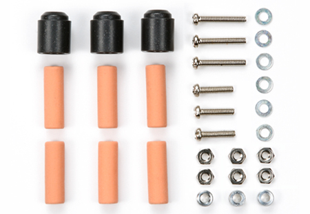 グレードアップパーツNo.413 ゴムブレーキセット RUBBER BRAKE SET Item No:15413 2010年7月17日(土)発売 216円(本体価格200円) ★リヤバンパーにパイプ形状のソケットを下向きに取り付け、そこにゴムをセットするシンプルな構成。 ★レーンチェンジやスロープを上り始める時、ブレーキゴムが路面と接触してマシンを減速させコースアウトを防ぎます。 ★付属のアルミカラーをセットすることで小径、大径タイヤに対応。 ★各種FRPプレートにも取り付けできます。
