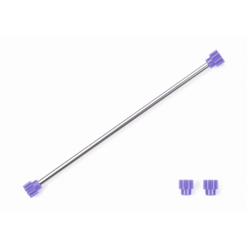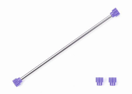 モーターパワーをフロントに伝達するプロペラシャフトは駆動系のポイント。キット標準のプロペラシャフトに比べて軽く仕上げられ、スピードアップに効果的。鮮やかなパープルカラーも特徴です。モーターにも取り付けられる樹脂製ピニオンギヤも2個セットしました。 ★対応シャーシ:タイプ5、スーパーFMシャーシ