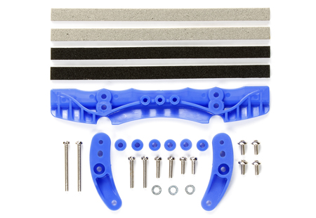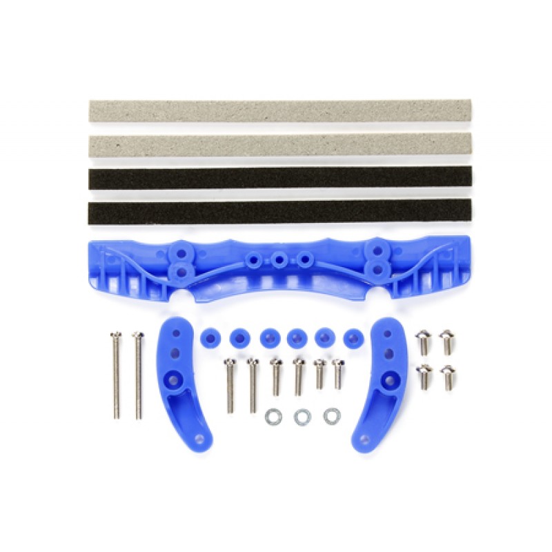 ミニ四駆限定 ARシャーシ ブレーキセット (ブルー) BRAKE SET(for AR CHASSIS)(BLUE) Item No:94969 2013年8月10日(土)発売 388円(本体価格360円) ★ブレーキ用スポンジは5mm幅にカットされ、摩擦力の異なる2種類を用意。★ステーは前方がスキッド形状になっているのでスポンジがはがれにくいのも特徴。★ブルーカラーが鮮やかです。